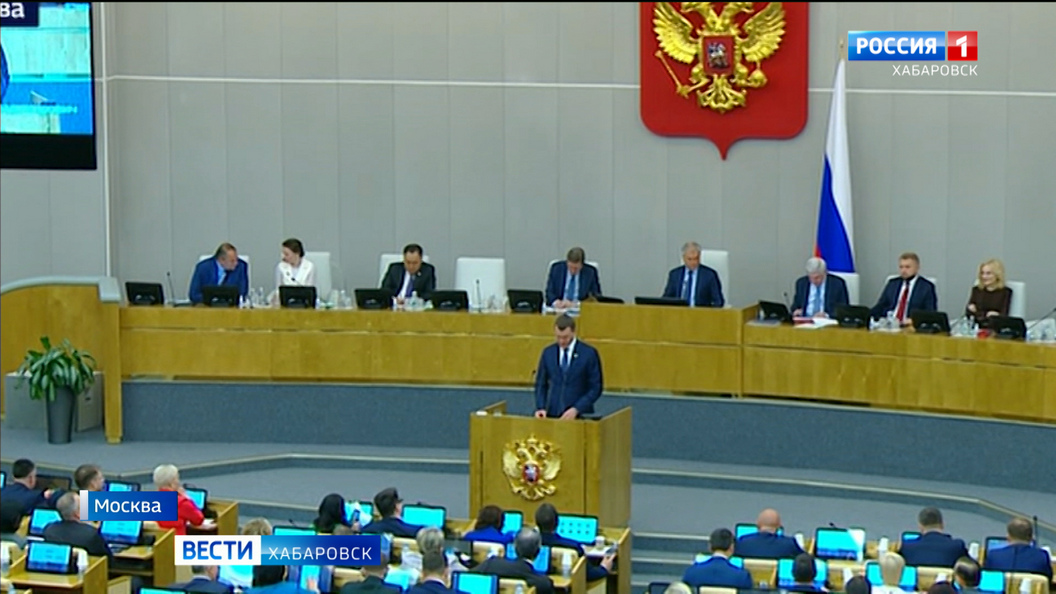 Пока Михаил Дегтярев идёт к трибуне, председатель Вячеслав Володин его представляет, хотя большинству в зале он хорошо знаком.