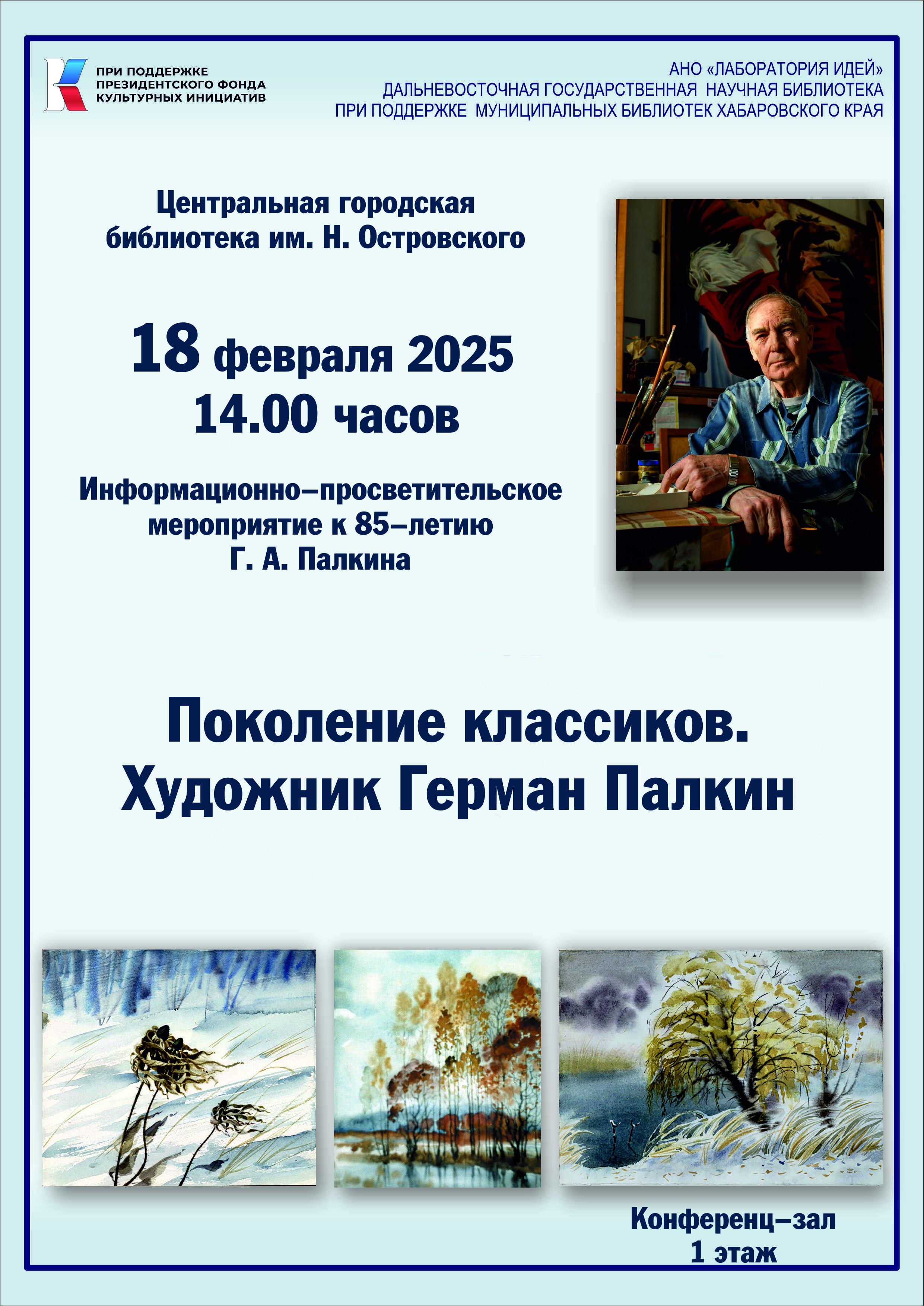18 февраля в 14.00 часов в Центральной городской библиотеке им. Н. Островского состоится мероприятие, посвященное 85-летию со дня рождения дальневосточного художника Германа Алексеевича Палкина.