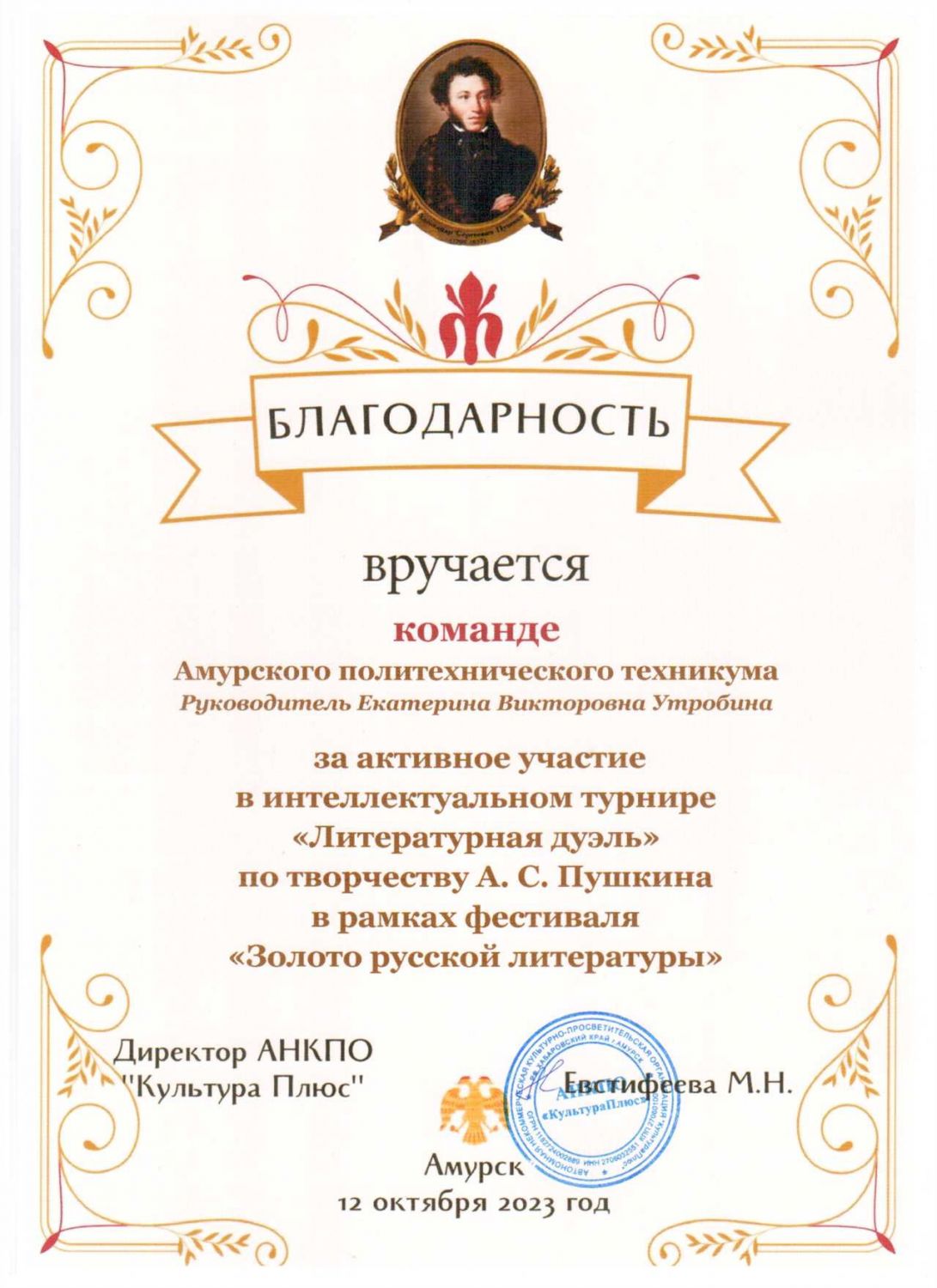 12 октября команда студентов группы 304 ПКД приняла участие в первом мероприятии фестиваля «Золото русской литературы» - интеллектуальном турнире «Литературная дуэль». В турнире, кроме студентов АПТ участвовали школьники города. В программу турнира были включены вопросы не только о творчестве великого русского поэта А.С.Пушкина, но и об обстоятельствах его жизни. Турнир состоял из шести этапов, три из которых были творческими заданиями и блиц-турнир. Ребята старались отвечать стихами. Писали мемуары от лица любимых вещей поэта, объяснялись в любви с помощью приёма «тавтология», активно участвовали во всех этапах турнира. Фестиваль продлится 3 месяца. Команду пригласили на мероприятия о творчестве Ивана Сергеевича Тургенева, Льва Николаевича Толстого, Антона Павловича Чехова с дегустацией любимых блюд писателей из русской кухни. Присоединяйтесь!!!