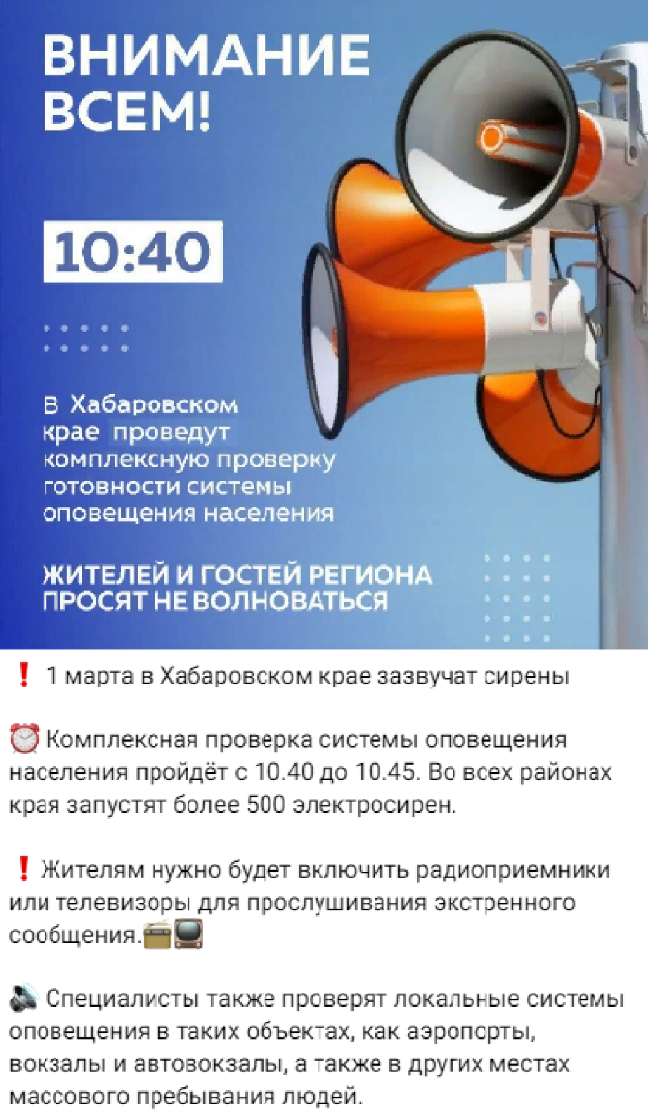Жителям нужно будет включить радиоприемники или телевизоры для прослушивания экстренного сообщения. Специалисты также проверят локальные системы оповещения в таких объектах, как аэропорты, вокзалы и автовокзалы, а также в других местах массового пребывания людей.
