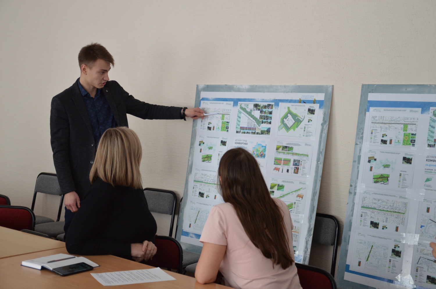 На встрече присутствовал начальник отдела архитектуры и градостроительства администрации городского поселения «Город Амурск» Котенков Юрий Валерьевич, который ознакомил волонтёров с дизайн-проектами общественных территорий,