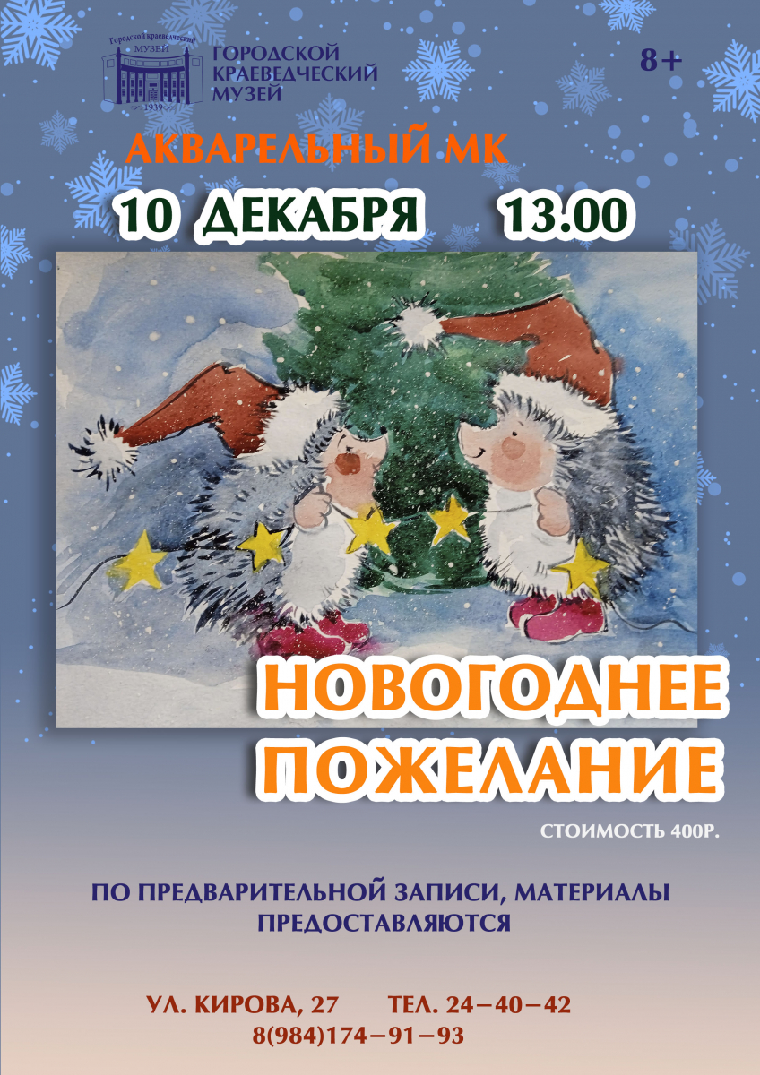 10 декабря в 13:00 в Краеведческом музее пройдет акварельный мастер-класс «Новогоднее пожелание».