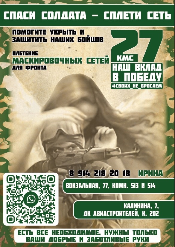 Можно помочь и личным участием в плетении сетей. Мастерские находятся по адресам: ул. Вокзальная, 77, комната № 513 и 514, ул. Калинина, 7, каб. 202. Еще один пункт плетения маскировочный сетей находится на ул. Калинина, 6 каб. 212.