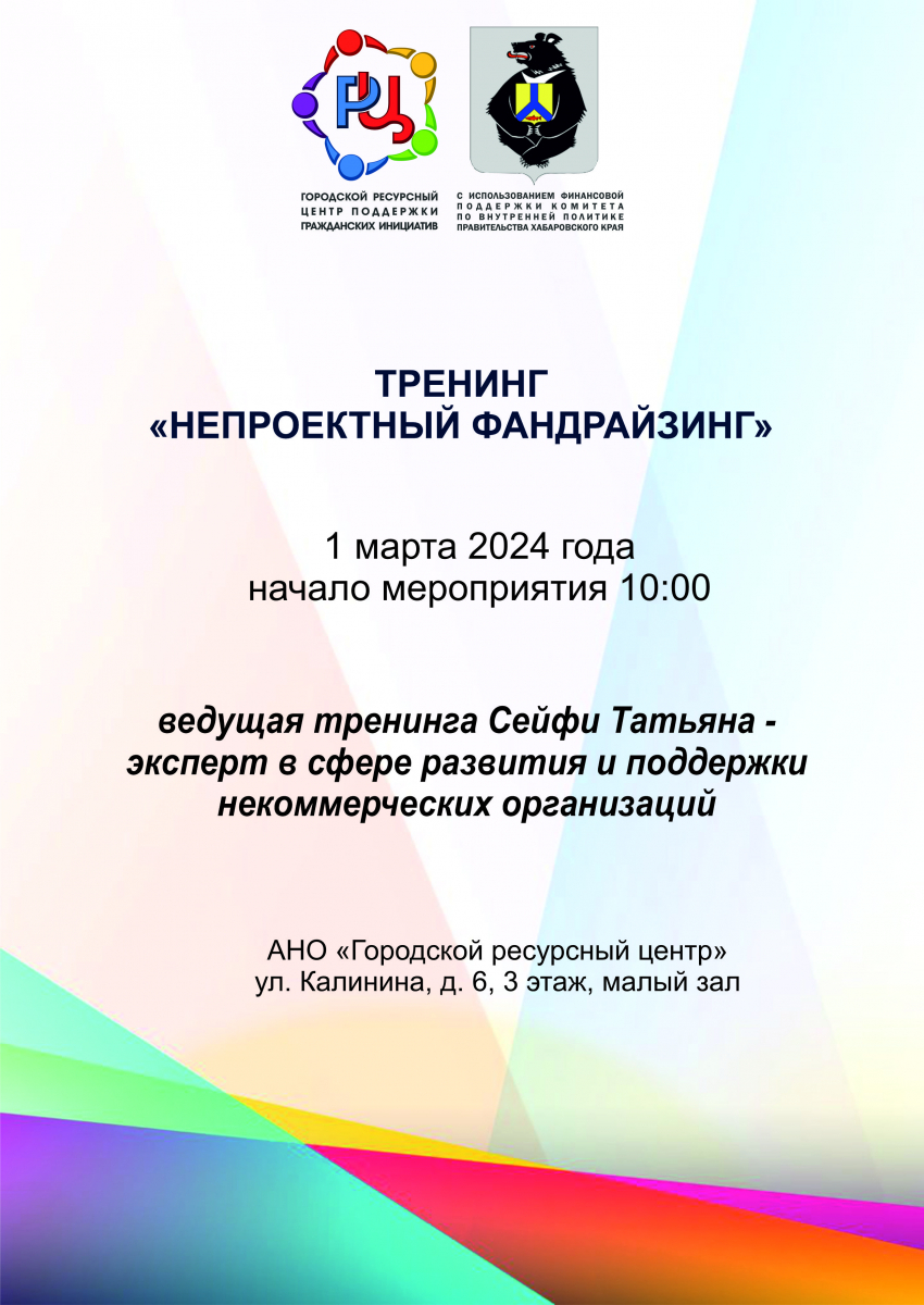 1 марта в административном здании по адресу ул. Калинина, 6 пройдет тренинг «Непроектный фандрайзинг» от Сейфи Татьяны – эксперта в сфере развития и поддержки некоммерческих организаций, город Москва.