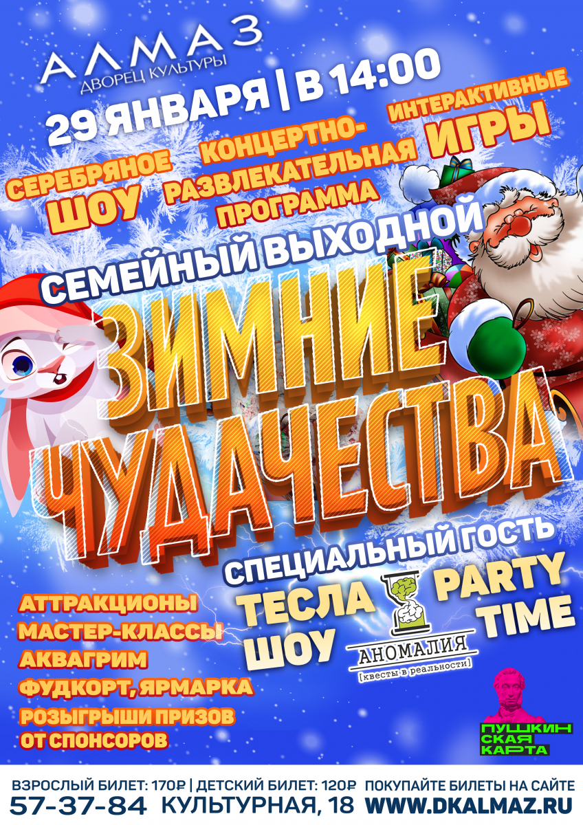 29 января в 14:00 Дворец культуры «Алмаз» приглашает комсомольчан на семейный выходной «Зимние чудачества».