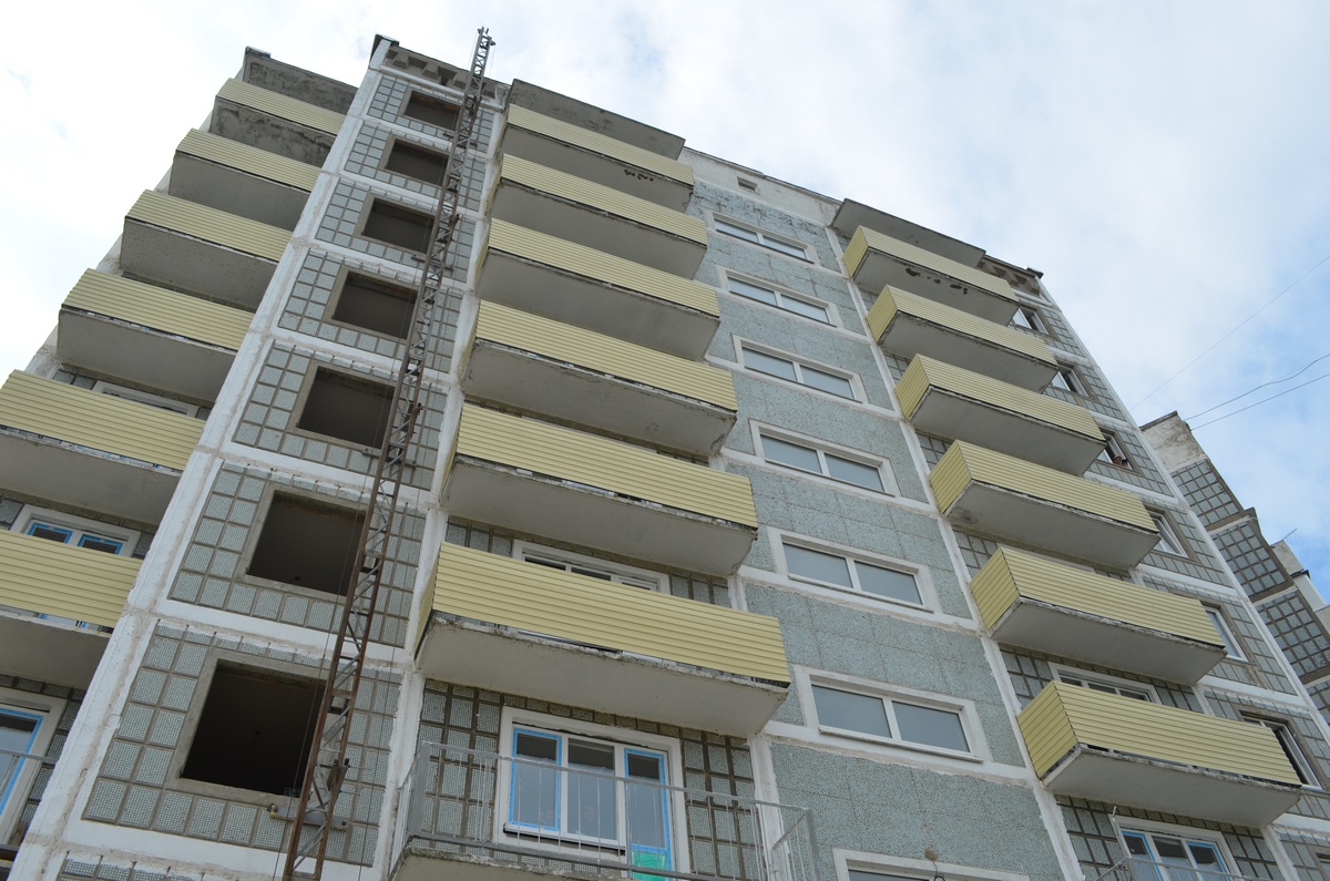 Коробка здания была возведена в начале 90-ых. В этом году за него взялся один из застройщиков города. Экспертиза подтвердила хорошее техническое состояние здания, застройщик сделал проект, соответствующий современным требованиям, который прошёл экспертизу. Сейчас дом достраивается, ведутся внутренние отделочные работы, идёт благоустройство территории, вставляются окна.