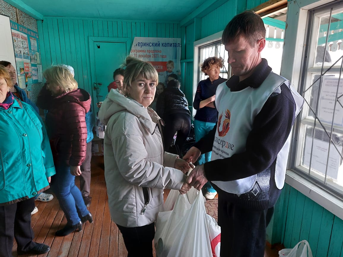 - В рамках проекта мы развозим гуманитарные продуктовые наборы для нуждающихся и семей мобилизованных. В каждый посёлок привозим по 30 наборов. Сначала раздаём их родственникам участников СВО, оставшиеся — одиноким пенсионерам и другим нуждающимся людям. В этом посёлке почти все наборы ушли семьям мобилизованных, столько их здесь оказалось, — рассказывает специалист по социальной работе ХКОО «Милосердие» Марина Потурай.