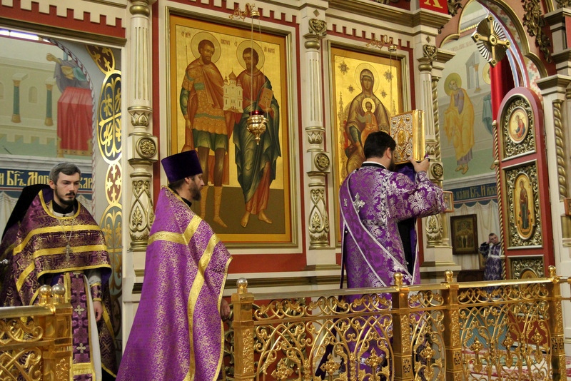 Его Высокопреосвященству сослужили: секретарь епархии иеромонах Николай (Белозеров), настоятель Спасо-Преображенском кафедральном собора протоиерей Георгий Сивков, и клирик собора иерей Антоний Новичков.
