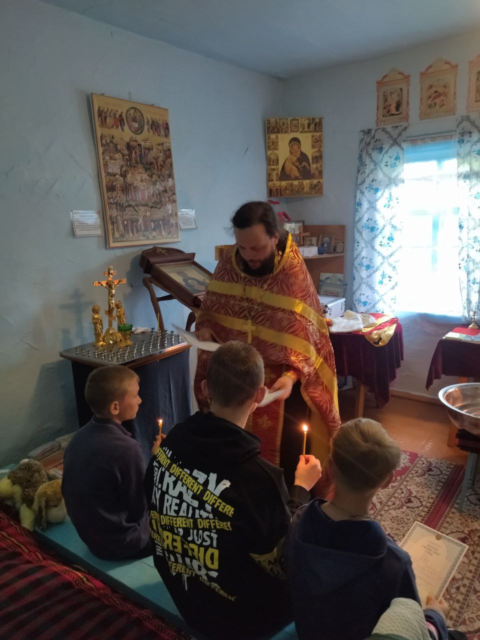 Суббота 20 мая 2023 года стала особенной в жизни пяти сельских ребят и их мамы. Сложно передать словами трепет, который царил в домовом храме в честь священномученика Иоанна Восторгова во время Крещения. Таинство совершил настоятель хабаровского храма святителя Иннокентия Иркутского иеромонах Софроний (Медведенко), который уже несколько лет окормляет поселок.
