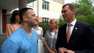 Сегодня, 26 июня, Михаил Дегтярев проинспектировал ход капитального ремонта в консультативной поликлинике краевой клинической больницы им. проф. С.И. Сергеева в Хабаровске. Кроме того, он вручил ключи от собственного жилья двум медикам.