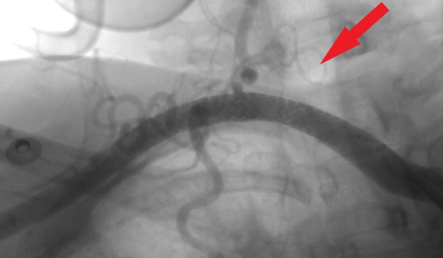Далее женщину перевезли в операционную рентгенэндоваскулярной хирургии, где уже с помощью раздувания небольшим баллонным катетером (2 мм) выполнено восстановление кровотока в артериях предплечья и кисти, после этого на подключичной артерии пораженной конечности была выполнена баллонная ангиопластика со стентированием (расширение сузившейся артерии с помощью специального стента).